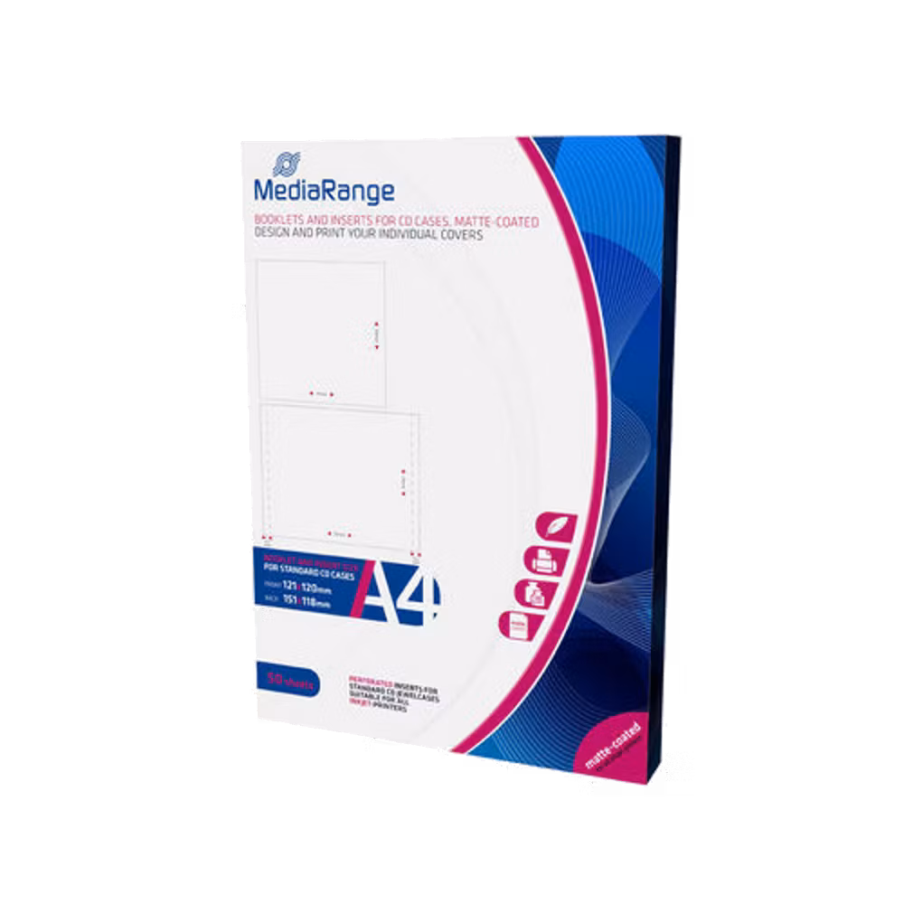 MediaRange innlegg for CD cover er perfekte for å tilpasse og organisere datainnsamlingen din. Det spesielle belegget lar deg skrive ut profesjonelle bilder i fotokvalitet. De perforerte sidene er dimensjonert akkurat for standard CD cover med en bredde på 10,4 mm og kan brukes med alle standard blekkskrivere.